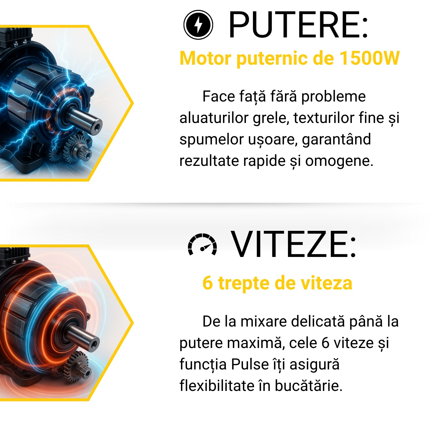 • Motor puternic de 1500W - Motorul performant asigură rezultate rapide și uniforme, chiar și pentru aluaturi dense, creme fine sau spume aerate.