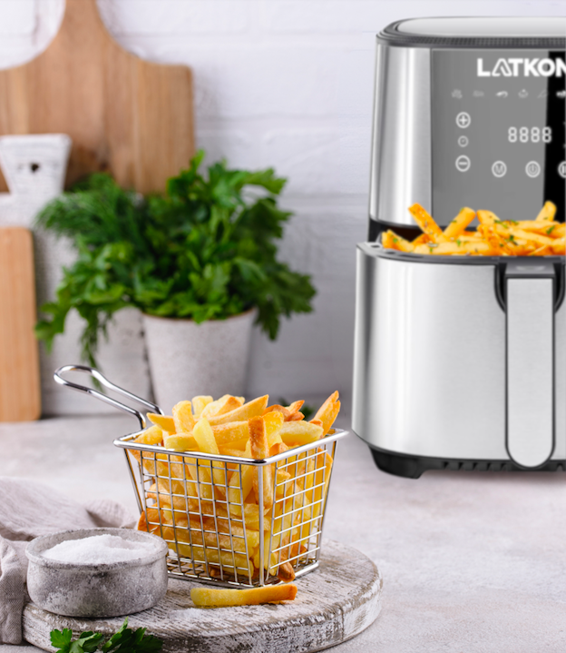 Aspectul atrăgător și simplu al Friteuzei Latkon se integrează perfect în orice bucătărie. Suprafața mată nu doar îmbunătățește estetica, ci și facilitează curățarea și uscarea aparatului. Descoperă un partener de încredere în bucătăria ta, gata să facă față oricărei provocări culinare.