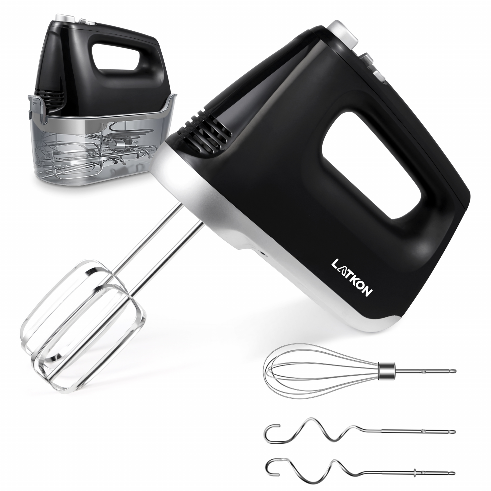 Mixer de mana Latkon® HMLTK01, 400 W, 6 Viteze, Functie Turbo, Cutie depozitare, Teluri si Carlige din inox, Negru/Argintiu