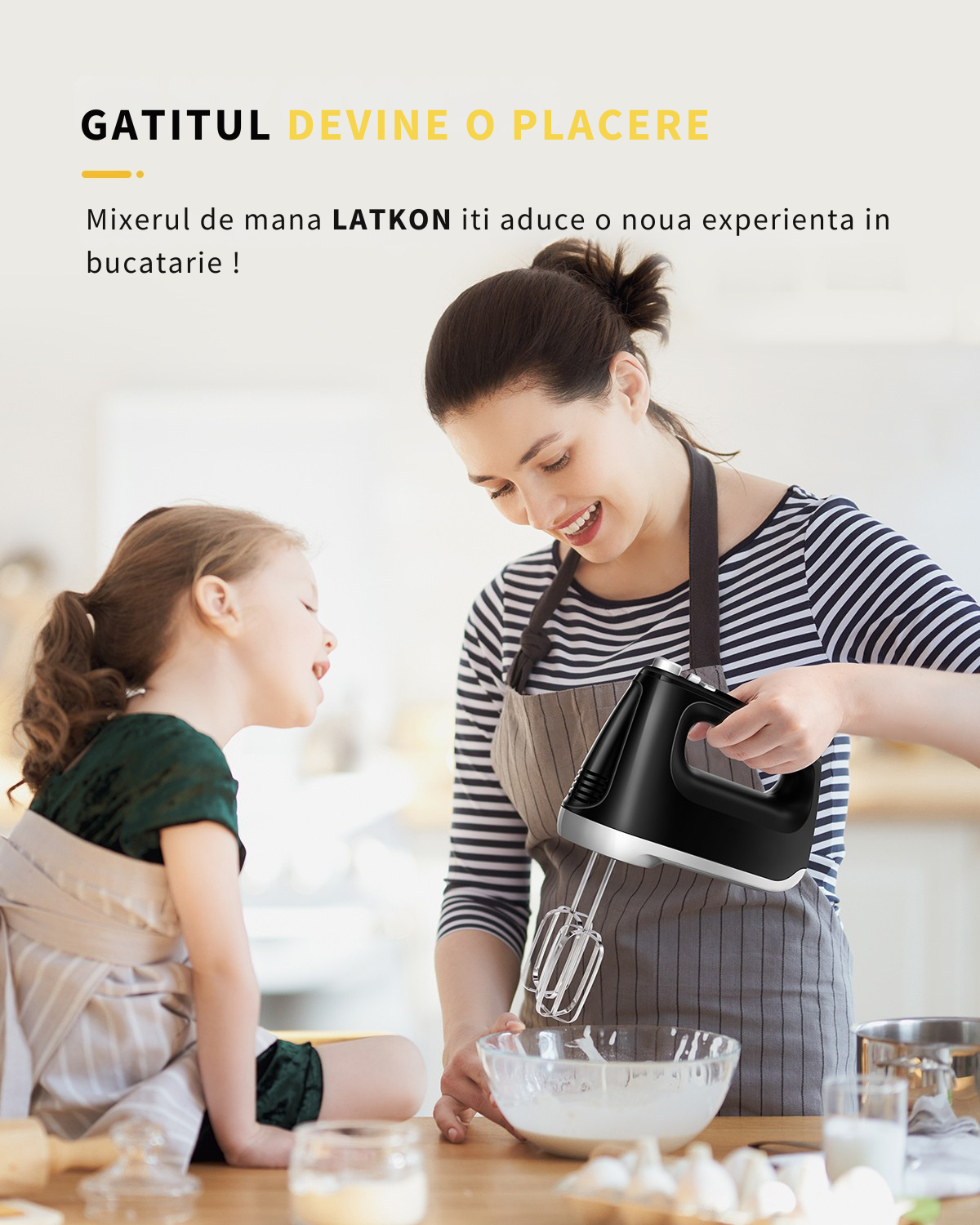 Mixerul de mana Latkon® HMLTK01 imbina un design practic cu performanta reala in bucatarie. Cu un motor puternic de 400 W din cupru pur, 6 trepte de viteza si functie Turbo, acest mixer te ajuta sa obtii texturi perfecte pentru orice preparat: de la frisca aerata la aluaturi dense de paine. In plus, datorita vitezei minime ultra-scazute, mixarea incepe lent, fara stropi, pentru o bucatarie curata. Mixerul vine echipat cu 5 accesorii rezistente din inox alimentar si o cutie pentru depozitare usoara – mereu la indemana, fara dezordine.