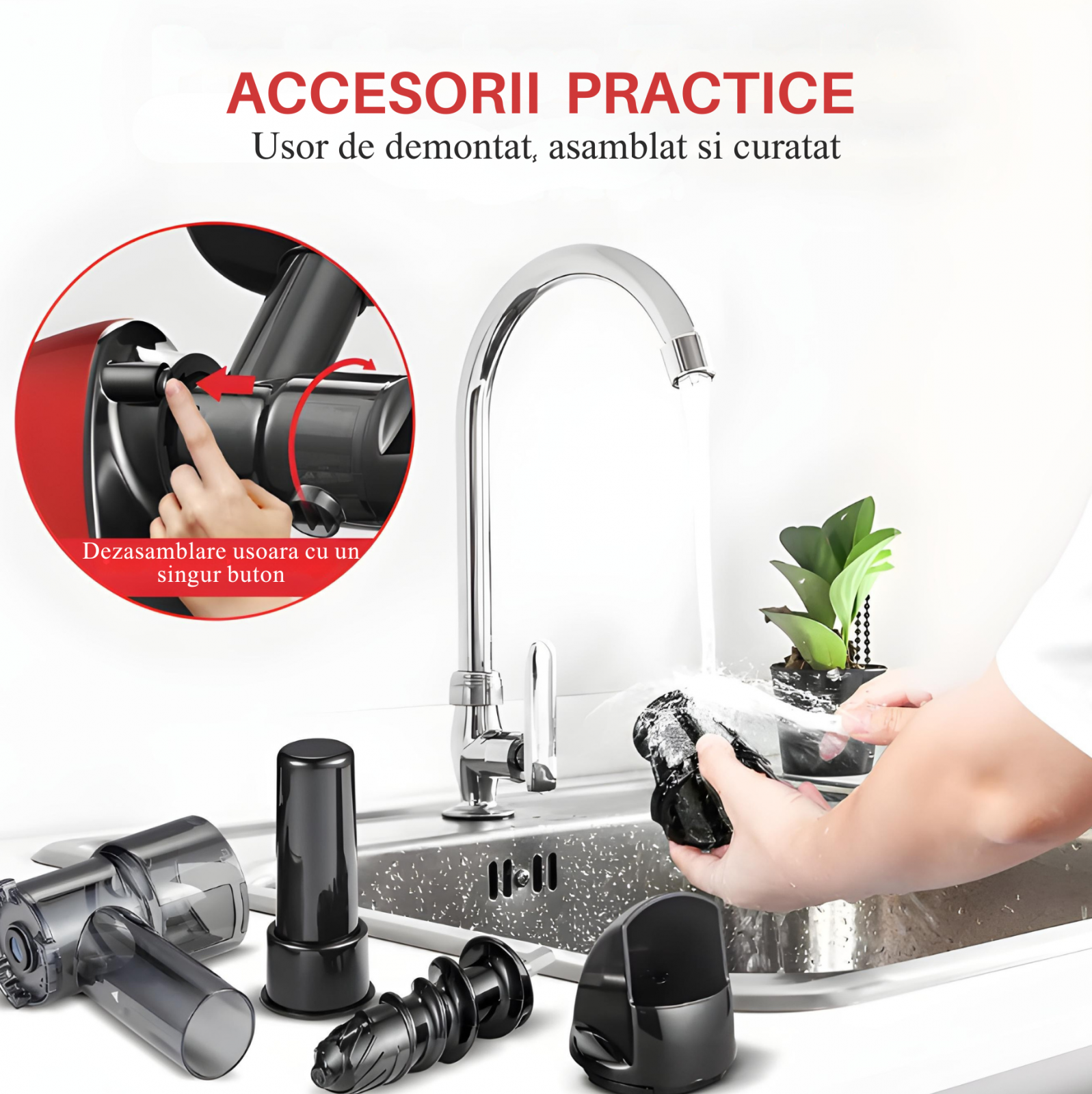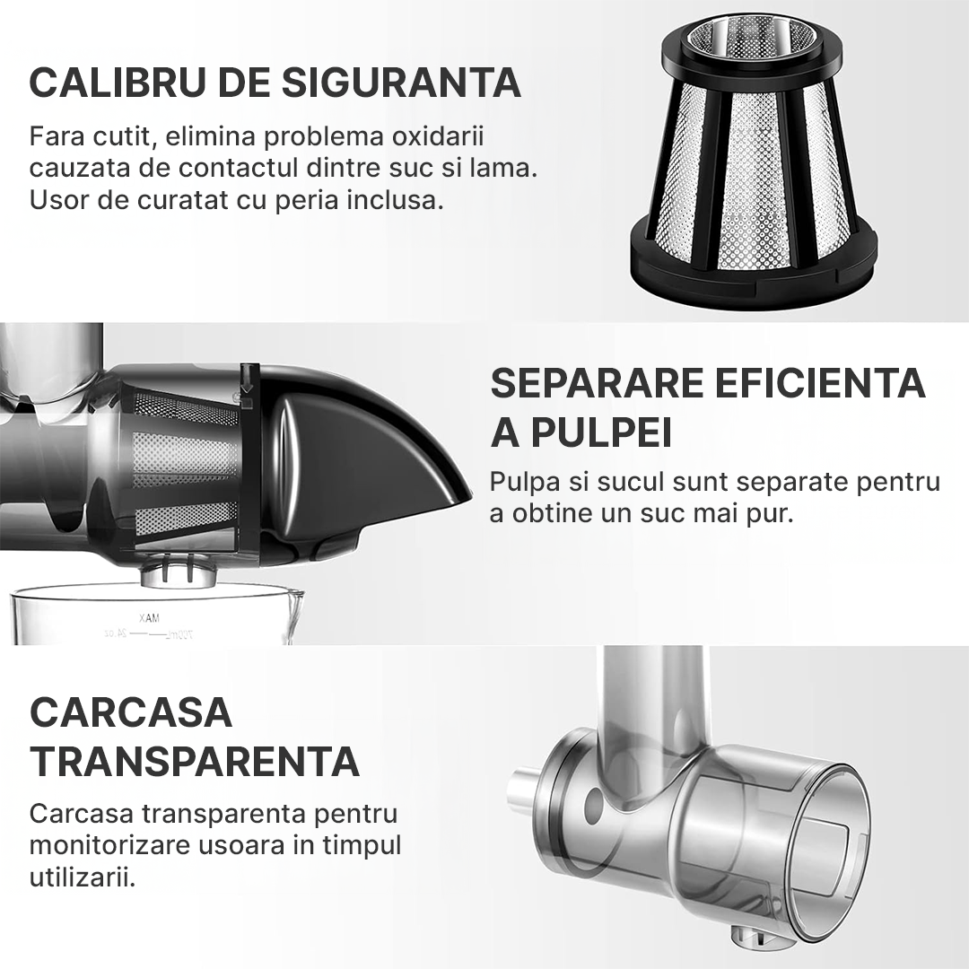 ✔ Accesorii incluse – Pachetul contine un recipient pentru suc, un recipient pentru pulpa, o perie de curatare si un manual de utilizare. Recomandam curatarea manuala a acestora pentru o durabilitate sporita.